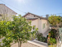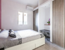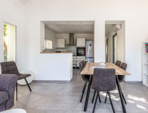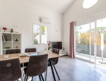 3-Zimmer-Villa 61 m2. Hell, schön und modern eingerichtet: Wohn-/Esszimmer mit TV (Flachbildschirm). Ausgang zur Terrasse. 2 Zimmer, jedes Zimmer mit 1 franz. Bett (140 cm, Länge 190 cm). Kochnische (Backofen, Geschirrspüler, 3 Induktionskochplatten, Mikrowelle, Tiefkühler, elektrische Kaffeemaschine). Dusche, sep. WC, Doppelwaschbecken. Klimaanlage. Grosse Terrasse. Terrassenmöbel, Elektrogrill, Liegestühle (2). Zur Verfügung: Waschmaschine, Bügeleisen. Internet (Wireless LAN, extra). Bitte beachten: TV nur FR. Rauchmelder. Es hat ein Ofen.- Ausstattung