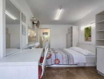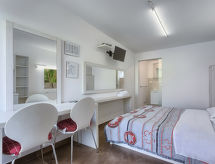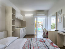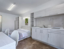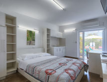 1-Zimmer-Wohnung 18 m2, im Erdgeschoss. Studio mit 1 franz. Bett (160 cm, Länge 200 cm), Sat-TV (Flachbildschirm), Klimaanlage. Ausgang zur Terrasse, zum Schwimmbad. Offene Küche (2 Glaskeramikherd Platten, Mikrowelle) mit Esstisch. Dusche/WC. Terrasse 6 m2, überdacht. Terrassenmöbel. Sicht auf das Schwimmbad. Zur Verfügung: Internet (Wireless LAN, gratis). Das Grundstück ist komplett eingezäunt. Unser Garten wartet auf Sie für einen Sprung in die Entspannung. Geeignet zum Grillen.- Ausstattung