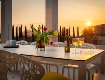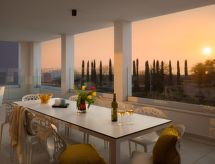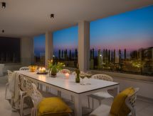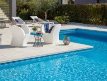 7-Zimmer-Villa 432 m2 auf 3 Stockwerken. Schön und gemütlich eingerichtet: 3 Zimmer, jedes Zimmer mit 1 franz. Bett (180 cm, Länge 200 cm), Dusche/WC und Klimaanlage. Ausgang zum Schwimmbad. Unteres Geschoss: 1 Zimmer mit 1 franz. Bett (180 cm, Länge 200 cm), Dusche/WC und Klimaanlage. Spielzimmer mit Klimaanlage. Ausgang zum Schwimmbad. Obergeschoss: Wohn-/Esszimmer 50 m2 mit Sat-TV und Klimaanlage. Ausgang zur Terrasse, zum Schwimmbad. 1 Zimmer mit 1 franz. Bett (180 cm, Länge 200 cm), Bad/Dusche/Bidet/WC, Sat-TV und Klimaanlage. Ausgang zur Terrasse. Offene Küche (Backofen, Geschirrspüler, 4 Glaskeramikherd Platten, Wasserkocher, Mikrowelle, Tiefkühler, elektrische Kaffeemaschine) mit Klimaanlage. Sep. WC. Warmluftheizung. Terrasse 60 m2, überdacht. Terrassenmöbel, Liegestühle, Abstellkammer. Sicht auf das Schwimmbad. Zur Verfügung: Safe, Babybett, Haartrockner. Internet (Wireless LAN, gratis). Bitte beachten: Feuerlöscher. Hoch platzierte Fenster im Untergeschoss. Im Erdgeschoss separater Eingang: finnische Sauna, Dusche, sep. WC, Ausgang zum Schwimmbad. Das Grundstück ist komplett eingezäunt. Die drückende Hitze kann Körper und Gemüt stark belasten. Deshalb sind die Räumlichkeiten mit Klimaanlagen ausgestattet. Geeignet für ein Barbecue. Es hat ein Babybett. Ihr Stoffwechsel kommt bei der Hitze in der vorhandenen Sauna auf Trab. Ein privater Pool ist verfügbar. Informieren Sie sich im über den vorhandenen TV Apparat. Ob lokale Neuigkeiten oder internationale Nachrichten, mit dem Fernsehen sind sie stehts gut informiert. Es gibt ein Wäschetrockner. Es gibt ein Billardtisch. Ein Tischtennistisch ist verfügbar. Um auch mal was schnell selber zuzubereiten, steht ein Mikrowellenofen parat.- Aktivitäten in der Nähe