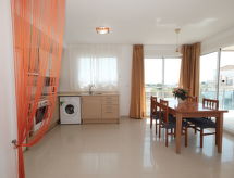 Appartementhaus "Olim". Oberhalb von Alcanar Playa, ausserhalb des Ortes, 3 km vom Zentrum von Sant Carlos de la Rapita, 500 m vom Meer, 820 m vom Strand. Zur Mitbenutzung: Garten, Schwimmbad (12 x 8 m, 80 - 200 cm tief, saisonale Verfügbarkeit: 01.Apr. - 30.Sep. Öffnungszeiten Schwimmbad: 10:00-21:00). Aussendusche, Poolpflege durch den Besitzer/Gärtner, öffentliche Parkplätze auf der Strasse. Einkaufsgeschäft 1 km, Lebensmittelgeschäft 700 m, Supermarkt 1 km, Einkaufszentrum 2 km, Restaurant, Bar 200 m, Fußgängerzone 5 m, Bushaltestelle "Alcanar Playa" 500 m, Sandstrand "Sant Carlos de la Rapita" 2 km, Steinstrand "Alcanar Playa" 700 m. Sporthafen 1 km, Segelschule 1 km, Sportzentrum 1 km. Nahe gelegene Sehenswürdigkeiten: Parque Natural del Delta de l'Ebre 20 km, Peñiscola 40 km, Vinaroz 20 km, Port Aventura Salou 80 km. Wandergebiete: La Foradada Sant Carlos de la Rapita 6 km. Bitte beachten: Fahrzeug empfohlen. Jugendgruppen nur auf Anfrage.Interior