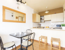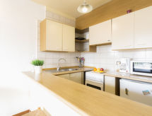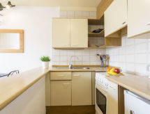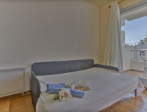 2-Zimmer-Wohnung 35 m2 im 1. Stock, Südwestlage. Objekt geeignet für 2 Erwachsene. Einfach eingerichtet: Wohn-/Esszimmer mit Esstisch und Sat-TV. Ausgang zum Balkon, Richtung Süden und Richtung Westen. 1 Zimmer mit 1 franz. Bett (140 cm, Länge 190 cm). Offene Küche (4 Kochplatten, Backofen, Mikrowelle, elektrische Kaffeemaschine). Bad/WC. Keine Heizmöglichkeit. Kleine Terrasse 6 m2. Terrassenmöbel. Zur Verfügung: Waschmaschine, Bügeleisen. Bitte beachten: 1 Haustier/Hund erlaubt. TV nur, FR. HUTG047653 Es gibt ein Balkon. Sollte das Wetter einmal nicht mitspielen, ist auch ein Fernseher vorhanden.- Ausstattung