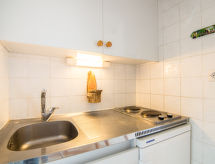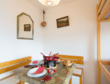 1-Zimmer-Wohnung 22 m2 im 4. Stock, Nordlage. Wohn-/Schlafzimmer mit 1 Doppeldiwanbett (140 cm, Länge 190 cm), 1 x 1 Etagenbetten (140 cm, Länge 190 cm), TV (Flachbildschirm). Ausgang zum Balkon, Richtung Norden. Kochnische (2 Kochplatten, Mini-Backofen, Toaster, Wasserkocher, Mikrowelle, elektrische Kaffeemaschine, Racletteofen). Bad/WC. E-Heizung. Balkon 4 m2, Nordlage. Terrassenmöbel. Schöne Sicht auf die Berge und das Tal. Zur Verfügung: Bügeleisen, Haartrockner. Internet (Wireless LAN, extra). Bitte beachten: Nichtraucher-Unterkunft. Rauchmelder. Achtung: Das franz. Bett ist in erhöhter Lage, 60 cm unter der Decke. Eine Badewanne ist vorhanden. Objekt verfügt über einen Aufzug. Es gibt ein beheizter Pool.- Ausstattung
