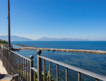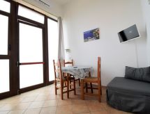 2-Zimmer-Wohnung 35 m2, im Erdgeschoss. Zweckmässig und komfortabel eingerichtet: Wohn-/Esszimmer mit 1 Diwanbett und Sat-TV (Flachbildschirm), Klimaanlage und Warmluftheizung. 1 Doppelzimmer mit Ventilator. Kochnische (4 Kochplatten, Backofen, Toaster, Wasserkocher, Mikrowelle, Tiefkühler, elektrische Kaffeemaschine). Dusche/Bidet/WC. Boiler (50 Liter). Herrliche Sicht auf das Meer. Zur Verfügung: Bügeleisen, Kinderhochstuhl, Babybett bis 2 Jahre, Haartrockner. Internet (Wireless LAN, gratis). Mit Aussicht aufs Meer.- Ausstattung