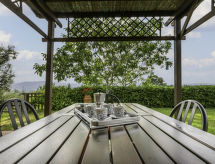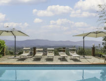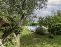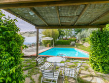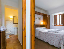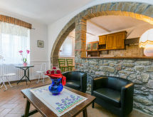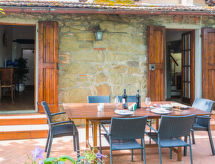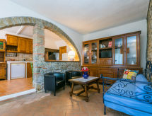 8-Zimmer-Haus 185 m2, im Erdgeschoss. Zweckmässig und rustikal eingerichtet: grosses Wohn-/Esszimmer mit offenem Kamin. Kleiner Salon mit TV. Ausgang zur Terrasse. 1 Doppelzimmer. 1 Doppelzimmer. 1 Zimmer mit 1 franz. Bett (140 cm). Wohn-/Esszimmer mit TV. 1 Doppelzimmer. 1 Zimmer mit 1 franz. Bett (140 cm). Küche (4 Kochplatten, Backofen, Geschirrspüler, Tiefkühler). 3 Duschen/Bidet/WC. Heizung (extra). Terrassenmöbel, Gartengrill. Panoramasicht auf die Landschaft. Zur Verfügung: Waschmaschine, Fliegengitter, Kinderhochstuhl, Babybett bis 2 Jahre, Haartrockner. Internet (Wireless LAN, gratis). 1 Haustier/Hund erlaubt. Das Haus ist auch mit einem Geschirrspüler ausgestattet. Es hat ein privater Pool. Es hat ein Internetanschluss.- Ausstattung