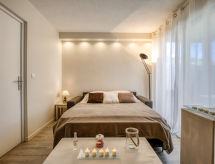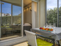 2-Zimmer-Wohnung 36 m2, im Erdgeschoss. Komfortabel und schön eingerichtet: Wohn-/Esszimmer mit 1 Doppeldiwanbett (1 x 140 cm, Länge 190 cm), TV (Flachbildschirm), Stereoanlage. Ausgang zur Loggia. 1 Zimmer mit 1 franz. Bett (1 x 140 cm, Länge 190 cm). Offene Küche (Backofen, Geschirrspüler, 3 Induktionskochplatten, Toaster, Wasserkocher, Mikrowelle, Tiefkühler, elektrische Kaffeemaschine) mit Bar. Dusche/WC. E-Heizung. Terrasse 6 m2, Nordlage und Westlage. Terrassenmöbel. Zur Verfügung: Waschmaschine, Bügeleisen, Haartrockner. Internet (Wireless LAN, gratis). Parkplatz Nr. 1237 (1 Auto). Bitte beachten: Rauchmelder. Residenz. Bequem mit dem Lift bis vor die Haustür. Es gibt ein Geschirrspüler. Es hat ein Pool.- Charakteristik des Mietobjekts