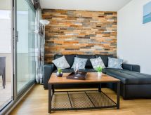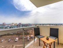 3-Zimmer-Wohnung 45 m2 im 6. Stock. Schön und geschmackvoll eingerichtet: Wohn-/Esszimmer mit 1 Doppeldiwanbett (1 x 140 cm, Länge 190 cm), TV (Flachbildschirm), Radio. Ausgang zum Balkon. 1 Zimmer mit 1 franz. Bett (1 x 160 cm, Länge 200 cm). Ausgang zum Balkon. 1 Zimmer mit 2 Betten (90 cm, Länge 200 cm). Offene Küche (Mini-Backofen, Geschirrspüler, 3 Induktionskochplatten, Toaster, Wasserkocher, Mikrowelle, elektrische Kaffeemaschine, Kapseln für die Kaffeemaschine (Senseo) extra) mit Bar. Dusche, sep. WC. E-Heizung. Balkon 5 m2, Südlage und Ostlage, Balkon 5 m2, Nordlage und Westlage. Balkonmöbel, Elektrogrill, Liegestühle (2). Schöne Sicht auf. Zur Verfügung: Waschmaschine, Bügeleisen, Haartrockner. Internet (Wireless LAN, gratis). Parkplatz Nr. 1587. Bitte beachten: Rauchmelder. Residenz. Sie gelangen mit dem Aufzug zur Etage der Wohnung. Geeignet für ein Barbecue.- Charakteristik des Mietobjekts