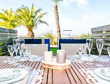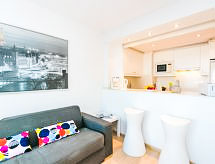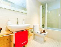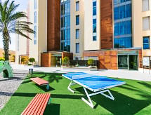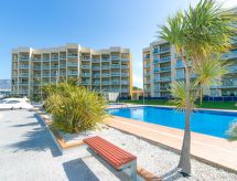 2-Zimmer-Wohnung 42 m2, im Erdgeschoss, Südwestlage. Geräumig und hell, sehr modern und luxuriös eingerichtet: Wohn-/Esszimmer mit 1 Doppeldiwanbett, Esstisch, Sat-TV und Digital-TV (Flachbildschirm), Klimaanlage, Warmluftheizung und elektrischem Rollladen. Ausgang zur Terrasse, zum Schwimmbad, Richtung Süden und Richtung Westen. 1 Zimmer mit 1 franz. Bett (1 x 140 cm, Länge 190 cm), Klimaanlage, Warmluftheizung und elektrischem Rollladen. Küche (Backofen, Geschirrspüler, 4 Glaskeramikherd Platten, Mikrowelle, Tiefkühler, elektrische Kaffeemaschine) mit Bar. Bad/WC. Grosse Terrasse 20 m2. Terrassenmöbel, Liegestühle (2). Panoramasicht auf die Landschaft und den Kanal. Zur Verfügung: Waschmaschine, Wäschetrockner. Internet (Wireless LAN, extra). Garage Nr. 90. Bitte beachten: Nichtraucher-Unterkunft. TV nur ES, FR. Tiere werden im Pool oder in Gemeinschaftsbereichen nicht akzeptiert. HUTG037134 Für Erkundigen rund um den Besuch in der Unterkunft bitten wir Sie, sich an die Rezeption zu wenden. Bequem mit dem Lift bis vor die Haustür. Der Spielplatz, der für Kinder geeignet ist steht zur Verfügung. Die Klimaanlage sorgt für eine gute Raumtemperierung. Denn der Wohlfühlfaktor spielt eine wichtige Rolle und ist uns wichtig. Es gibt ein Pool. Es hat ein Wäschetrockner. Es gibt ein Tischtennistisch.- Ausstattung