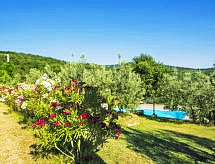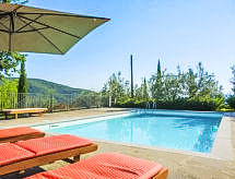 4-Zimmer-Haus 100 m2 auf 2 Stockwerken. Komfortabel und mit viel Holz eingerichtet: Eingang. 1 Doppelzimmer. Küche (4 Kochplatten, Geschirrspüler, Mikrowelle, Tiefkühler) mit Esstisch, offenem Kamin. Dusche/Bidet/WC, Hydromassage-Dusche. Obergeschoss: grosses Wohn-/Esszimmer mit offenem Kamin, Sat-TV und Flachbildschirm. Ausgang zur Terrasse, zum Gartensitzplatz, zum Schwimmbad. 1 Doppelzimmer. 1 Zimmer mit 1 Bett und 1 Doppelbett. Dusche/Bidet/WC. G-Heizung. Terrasse 150 m2, grosser Gartensitzplatz 30 m2, teilweise überdacht. Terrassenmöbel, Gartengrill, Liegestühle. Sehr schöne Panoramasicht auf die Landschaft. Zur Verfügung: Waschmaschine, Fliegengitter, Babybett bis 2 Jahre, Haartrockner. Internet (Wireless LAN, gratis). Parkplatz. 1 Haustier/Hund erlaubt. Ein privater Pool ist verfügbar.- Ausstattung