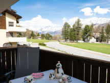 "Chesa Pra dSura 217", 2-Zimmer-Wohnung 52 m2 im 1. Stock. Hell, einfach und gemütlich eingerichtet: Wohn-/Esszimmer mit offenem Kamin (nur Deko), TV (Flachbildschirm). Ausgang zum Balkon. 1 Doppelzimmer mit 1 Doppelbett (2 x 90 cm, Länge 200 cm). Kleine Küche (3 Kochplatten, Backofen, Geschirrspüler, Toaster, Wasserkocher, elektrische Kaffeemaschine, Fondue Set (Käse)). Bad/WC. Teppichboden. Balkonmöbel. Schöne Sicht auf die Landschaft und die Ortschaft. Zur Verfügung: Haartrockner. Internet (Wireless LAN, gratis). Garage Nr. 217 (1 Auto), Höhe 200 cm, Breite 210 cm. Bitte beachten: Nichtraucher-Unterkunft. Badewanne im Haus. Das Ferienobjekt verfügt über einen Personenaufzug.- Ausstattung