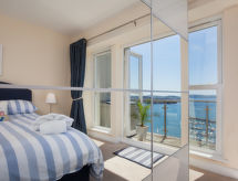 3-Zimmer-Wohnung im 2. Stock. Geräumig und hell, komfortabel und geschmackvoll eingerichtet: offenes Wohnzimmer mit TV, Flachbildschirm und DVD. Ausgang zum Balkon. 1 Doppelzimmer mit 1 Doppelbett und Dusche/WC. 1 Zimmer mit 2 Betten. Offene Küche (4 Kochplatten, Backofen, Geschirrspüler, Mikrowelle, Tiefkühler) mit Esstisch. Dusche/WC, Bad/Dusche/WC. Heizung. Terrassenmöbel. Schöne Sicht auf das Meer. Zur Verfügung: Waschmaschine. Internet (Wireless LAN, gratis). Bitte beachten: Nichtraucher-Haus. Der Garten ist ideal für alle, die dem Stress des Alltagslebens entfliehen möchten. Überdies werden sie verwöhnt mit einem freien Blick auf das Meer. Informieren Sie sich im über den vorhandenen TV Apparat. Ob lokale Neuigkeiten oder internationale Nachrichten, mit dem Fernsehen sind sie stehts gut informiert. Ein DVD Spieler ist verfügbar. Das Haus ist auch mit einem Ofen ausgestattet.- Ausstattung