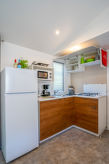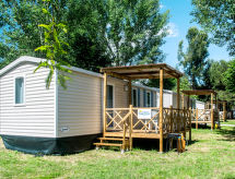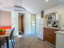 "Happy Premium Suite", 4-Zimmer-Mobilheim 30 m2. Komfortabel eingerichtet: Wohn-/Esszimmer mit E-Heizung und Klimaanlage. 1 Zimmer mit 1 franz. Bett (140 cm, Länge 190 cm). 2 Zimmer, jedes Zimmer mit 2 Betten (70 cm, Länge 190 cm). Offene Küche (4 Kochplatten, Mikrowelle, Tiefkühler, elektrische Kaffeemaschine). Dusche/WC. Klimaanlage (extra). Terrasse teilweise überdacht. Terrassenmöbel, Elektrogrill (mobil), Liegestühle (2). Zur Verfügung: Fliegengitter. Parkplatz (1 Auto) beim Haus. Bitte beachten: Nichtraucher-Unterkunft. An der Rezeption erhalten Sie den Schlüssel Ihrer Ferienunterkunft sowie weitere hilfreiche Informationen. Auf Platz befindet sich ein Restaurant. Mit eingezäuntem Grundstück. Es hat ein Kinderbecken. Es hat ein Wäschetrockner.- Ausstattung