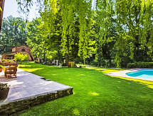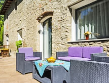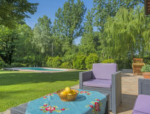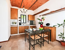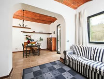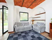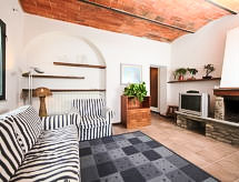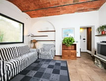 2-Zimmer-Wohnung 50 m2, im Erdgeschoss. Renoviert im Jahre 2014: Wohn-/Esszimmer mit 1 Doppeldiwanbett, offenem Kamin und TV. 1 Doppelzimmer. Kochnische (4 Kochplatten, Backofen, Geschirrspüler, Mikrowelle, Tiefkühler). Dusche/Bidet/WC. G-Heizung (extra). Terrassenmöbel, Gartengrill. Zur Verfügung: Haartrockner. Internet (Wireless LAN, gratis). Es hat ein Pool.- Ausstattung