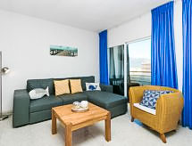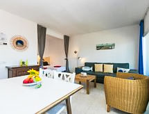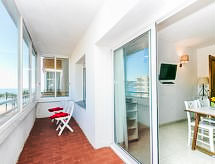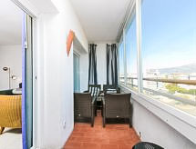 2-Zimmer-Wohnung 42 m2 im 5. Stock. Zweckmässig und komfortabel eingerichtet: offenes Wohn-/Schlafzimmer mit Vorhang mit 2 Betten und Sat-TV (Flachbildschirm). Ausgang zur Veranda. 1 Zimmer mit 1 franz. Bett. Offene Küche (2 Kochplatten, Mikrowelle, Tiefkühler). Dusche, sep. WC. Keine Heizmöglichkeit. Terrasse 10 m2. Terrassenmöbel. Seitliche Sicht auf das Meer. Zur Verfügung: Waschmaschine. Internet (Wireless LAN, gratis). Bitte beachten: TV nur DE, FR. HUTG006599 Residenz. Bequem mit dem Lift bis vor die Haustür.- Charakteristik des Mietobjekts