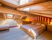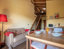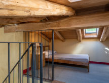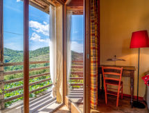 "Rosso", 1-Zimmer-Wohnung 30 m2 auf 2 Stockwerken. Geschmackvoll und gemütlich eingerichtet: Wohn-/Schlafzimmer mit Esstisch und Stereoanlage. Ausgang zum Balkon. Kleine, offene Küche (2 Induktionskochplatten). Dusche/WC. Obergeschoss: (Leiter) abgeschrägte, offene Galerie, Deckenhöhe 120 - 150 cm mit Dachfenster mit 1 franz. Bett (160 cm). Heizung. Holzböden, Natursteinböden. Balkon, Gartensitzplatz. Balkonmöbel. Panoramasicht. Zur Verfügung: Internet (Wireless LAN, gratis). Bitte beachten: Nichtraucher-Unterkunft. Maximal 1 Haustier/Hund erlaubt. Eigener Eingang. In Gehweite wird ein Gastlokal betreiben. Es hat ein Balkon. Das Haus ist auch mit einem Wäschetrockner ausgestattet.- Ausstattung