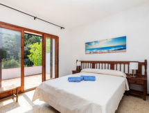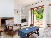 "S'Esquirols III", 3-Zimmer-Wohnung 90 m2. Rustikal eingerichtet: Wohn-/Esszimmer mit offenem Kamin, Esstisch, Digital-TV und Flachbildschirm. Ausgang zur Terrasse. 1 Zimmer mit 1 franz. Bett (150 cm, Länge 190 cm). Ausgang zum Balkon. 1 Zimmer mit 1 Bett (80 cm, Länge 190 cm), 1 x 2 Etagenbetten (80 cm, Länge 180 cm). Küche (3 Kochplatten, Backofen). Dusche/WC. Terrasse 20 m2. Terrassenmöbel. Zur Verfügung: Bügeleisen, Kinderhochstuhl, Babybett. Internet (Wireless LAN, gratis). Parkplatz (1 Auto) beim Haus. HUTG-002440 Es gibt ein Balkon. Ein Babybett ist vorhanden. Es gibt ein Internetanschluss.- Ausstattung
