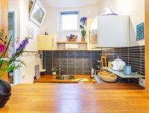 1-Zimmer-Studio 23 m2 im 1. Stock, Südlage. Schön eingerichtet: Wohn-/Esszimmer mit 1 Doppeldiwanbett (1 x 160 cm, Länge 190 cm), TV (Flachbildschirm). Kochnische (2 Kochplatten, Wasserkocher, Mikrowelle, elektrische Kaffeemaschine). Dusche/WC. Parkettböden. Zur Verfügung: Internet (Wireless LAN, gratis). Bitte beachten: Kühlschrank ohne Gefrierfach, Nichtraucher-Unterkunft. Rauchmelder, kein Fahrstuhl. Inserat einer Privatperson nach Artikel 155, IV, CGI.- Ausstattung