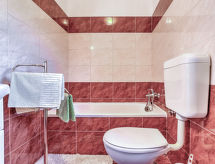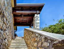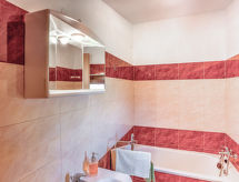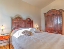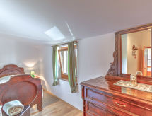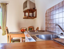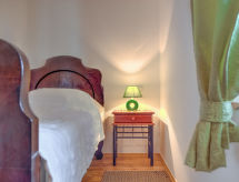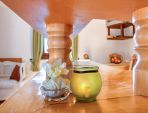 3-Zimmer-Doppelhaushälfte 45 m2 im 1. Stock. Schön und rustikal eingerichtet: Eingang mit Klimaanlage. Wohn-/Esszimmer mit Sat-TV. 1 Zimmer mit 1 franz. Bett (140 cm, Länge 190 cm). 1 Zimmer mit 1 Bett. Kochnische (2 Kochplatten). Bad/WC. Kleine Terrasse. Terrassenmöbel. Zur Verfügung: Internet (Wireless LAN, gratis). Die Schlafzimmer befinden sich 3 Stufen unterhalb des Wohn-/Esszimmers. Es hat ein Parkplatz.- Ausstattung