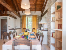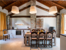 7-Zimmer-Haus 280 m2 auf 2 Stockwerken. Objekt geeignet für 10 Erwachsene + 2 Kinder. Vollständig renoviert im Jahre 2022, komfortabel und geschmackvoll eingerichtet: Wohn-/Esszimmer mit offenem Kamin. Ausgang zur Terrasse. 1 Doppelzimmer mit Dusche/WC. Küche (Backofen, Geschirrspüler, 4 Induktionskochplatten, Tiefkühler, elektrische Kaffeemaschine, Pizzaofen) mit Schwedenofen. Ausgang zur Terrasse. Obergeschoss: 2 Zimmer, jedes Zimmer mit 1 Doppelbett. 1 Zimmer mit 1 Doppeldiwanbett und 1 Doppelbett. Durchgangszimmer mit 1 Doppelbett. 2 Duschen/Bidet/WC, Whirlbadewanne. Heizung, Klimaanlage. Heizung nur verfügbar von 01.10. bis 30.04. Holzböden, Natursteinböden. Grosse Terrasse 100 m2. Terrassenmöbel, Gartengrill. Panoramasicht. Zur Verfügung: Internet (Wireless LAN, gratis). Im Idyllischen Garten geniessen Sie Erholung als ein Naturerlebnis. Für Ihr Wohlbefinden geniessen den Whirlpool in der Urlaubszeit. Das Haus ist auch mit einem Babybett ausgestattet. Das Haus ist auch mit einem Geschirrspüler ausgestattet. Das Haus ist auch mit einer Feuerstelle ausgestattet. Es hat ein Pool. Das Haus ist auch mit einem privaten Pool ausgestattet. Ein Ofen ist vorhanden.- Ausstattung