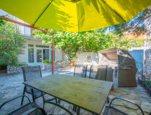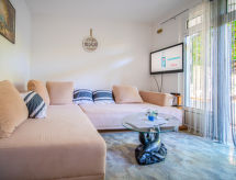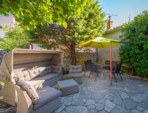 4-Zimmer-Reihenhaus 90 m2 auf 2 Stockwerken. Wohn-/Esszimmer mit Sat-TV und Klimaanlage. Ausgang zur Terrasse. 1 Zimmer mit 2 Betten (80 cm, Länge 190 cm). Offene Küche (Backofen, 4 Glaskeramikherd Platten, Wasserkocher, Mikrowelle, Tiefkühler, elektrische Kaffeemaschine). Sitzbad/WC. Obergeschoss: 1 Zimmer mit 1 franz. Bett (160 cm, Länge 200 cm). 1 Zimmer mit 1 Doppelbett (2 x 90 cm, Länge 200 cm), Klimaanlage. Ausgang zum Balkon. Bad/WC. Balkon 5 m2, Terrasse 80 m2. Terrassenmöbel, Balkonmöbel, Gartengrill (mobil). Zur Verfügung: Waschmaschine. Internet (Wireless LAN, gratis). Es hat ein Internetanschluss. Ein Ofen ist vorhanden.- Ausstattung