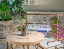 "Stafylos", 2-Zimmer-Wohnung 32 m2, im Erdgeschoss. Modern und stilvoll eingerichtet: offenes Wohn-/Schlafzimmer mit 1 Diwanbett, offenem Kamin und TV (Flachbildschirm). 1 offenes Doppelzimmer mit 1 Doppelbett, Dusche/WC und TV (Flachbildschirm). Kleine Kochnische (2 Glaskeramikherd Platten, Toaster, Wasserkocher, elektrische Kaffeemaschine, Kapseln für die Kaffeemaschine (Illy) extra) mit kleinem Esstisch. Ausgang zur Terrasse. Klimaanlage. Kleine Terrasse teilweise überdacht. Zur Verfügung: Safe, Bügeleisen, Haartrockner. Nicht geeignet für Kinder unter 17 Jahren. 1198463 Residenz. Gerne servieren wir Ihnen das Frühstück. Die drückende Hitze kann Körper und Gemüt stark belasten. Deshalb sind die Räumlichkeiten mit Klimaanlagen ausgestattet. Mit Reinigung.- Charakteristik des Mietobjekts