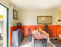 "Studio coquet", 1-Zimmer-Studio 30 m2, im Erdgeschoss. Zweckmässig und gemütlich eingerichtet: Wohn-/Esszimmer mit 1 franz. Bett (140 cm, Länge 190 cm), TV (Flachbildschirm). Ausgang zum Gartensitzplatz. Kochnische (Mini-Backofen, Backofen, 4 Glaskeramikherd Platten, Toaster, Wasserkocher, Mikrowelle, elektrische Kaffeemaschine). Dusche/WC. E-Heizung. Kleiner Gartensitzplatz 20 m2. Terrassenmöbel, Gartengrill (mobil), Liegestühle (2). Zur Verfügung: Waschmaschine, Bügeleisen. Internet (Wireless LAN, gratis). Bitte beachten: Nichtraucher-Haus. 1 kleines Haustier/Hund erlaubt. Rauchmelder. Ein Feriengenuss für Mensch und Tier. Hierbei handelt es sich um eine Hunde- und katzenfreundliche Ferienunterkunft. Eine Waschmaschine ist zum gebrauch vorhanden. Ein Mikrowellenofen ist auch vorhanden.- Ausstattung