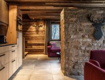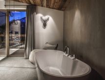 "Jagd - Chalet", 4-Zimmer-Chalet 115 m2 auf 2 Stockwerken. Sehr modern und mit viel Holz eingerichtet: Eingang. 1 Doppelzimmer mit Dusche/WC und Sat-TV (Flachbildschirm). Grosse Wohnküche (Backofen, Geschirrspüler, 4 Glaskeramikherd Platten, Tiefkühler, elektrische Kaffeemaschine) mit Essecke und Sat-TV (Flachbildschirm). Ausgang zur Terrasse. Obergeschoss: 1 Zimmer mit 1 Bett, 1 Doppelbett und Sat-TV (Flachbildschirm). Bad/Dusche/WC, Doppelwaschbecken. Grosse Terrasse. Balkonmöbel, Liegestühle. Herrliche Panoramasicht auf die Berge und die Ortschaft. Zur Verfügung: Sauna, Haartrockner. Internet (Wireless LAN, gratis). Bitte beachten: 1 Haustier/Hund erlaubt. Rauchmelder. Die Infrarot Kabine und die Badewannde befinden sich im Badezimmer im 1. Stock. Des weiteren verfügt diese Badezimmer über einen seperaten Balkon Zugang. Bei Belegung mit weniger Personen als der maximalen Personenzahl stehen nicht alle Wohneinheiten zur Verfügung. Ist ein regelmäßiges Duschritual fest im Tagesablauf verankert? Das schaffen wir, denn eine Dusche ist vorhanden. Bei der im Haus befindlichen Sauna kommt Ihr Stoffwechsel bei der Hitze auf Trab.- Ausstattung