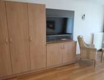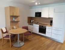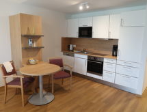 "Titisee", 1-Zimmer-Wohnung 48 m2 im 1. Stock. Hell, modern eingerichtet: grosses Wohn-/Schlafzimmer mit 1 Doppelbett (180 cm, Länge 200 cm), Sat-TV und Flachbildschirm. Ausgang zum Balkon. Offene Küche (Backofen, Geschirrspüler, 4 Glaskeramikherd Platten, Wasserkocher, Mikrowelle, elektrische Kaffeemaschine) mit Sat-TV und Flachbildschirm. Dusche/WC. Heizung. Parkettböden. Kleiner Balkon 8 m2. Balkonmöbel. Schöne Panoramasicht auf die Berge und die Ortschaft. Zur Verfügung: Haartrockner. Internet (Wireless LAN, gratis). Bitte beachten: Nichtraucher-Unterkunft. Rauchmelder. Die Wohnung ist barrierefrei und für Rollstuhlfahrer geeignet. Objekt mit Lift. Es gibt ein Internetanschluss. Das Haus ist auch mit einem Ofen ausgestattet.- Ausstattung