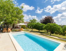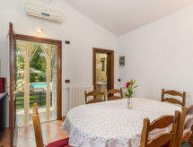 Einfamilienhaus "Tomazin". Im Weiler Vela Traba, 7 km vom Zentrum von Pazin, 25 km vom Meer, im Grünen. Zur Alleinbenutzung: Grundstück 2'000 m2, Bäumen, Wiese, Schwimmbad eckig (8 x 3 m, 135 cm tief, saisonale Verfügbarkeit: 15.Mai. - 17.Sep.) mit Innentreppe. Aussendusche, Terrasse, Gartenmöbel, Grill. Im Hause: Internetzugang, Waschmaschine. Zufahrt bis zum Haus (100 m Naturweg). Parkplatz auf dem Grundstück. Einkaufsgeschäft 3 km, Kieselstrand 25 km.Interior
