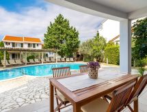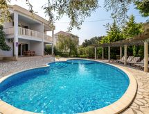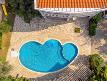 "Tomislav 2", 2-Zimmer-Wohnung 48 m2, im Erdgeschoss. Modern und gemütlich eingerichtet: Wohn-/Esszimmer 30 m2 mit 1 Doppeldiwanbett (145 cm, Länge 195 cm), Sat-TV und Klimaanlage. Ausgang zur Terrasse, zum Schwimmbad. 1 Zimmer mit 1 Doppelbett (160 cm, Länge 200 cm). Ausgang zur Terrasse. Offene Küche (4 Kochplatten, Mikrowelle, Tiefkühler). Dusche/WC. Terrasse 12 m2, überdacht. Terrassenmöbel. Sicht auf das Schwimmbad. Zur Verfügung: Safe. Internet (Wireless LAN, gratis). Parkplatz. Mit eingezäuntem Grundstück. Ein Pool ist verfügbar. Ein beheizter Pool ist verfügbar. Es hat ein Kinderbecken.- Ausstattung