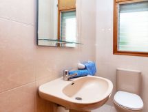5-Zimmer-Villa 130 m2, im Erdgeschoss. Zweckmässig eingerichtet: Wohn-/Esszimmer mit Digital-TV und Flachbildschirm. Ausgang zur Terrasse. 1 Zimmer mit 1 franz. Bett (135 cm, Länge 190 cm). 2 Zimmer, jedes Zimmer mit 2 Betten (90 cm, Länge 190 cm). 1 Zimmer mit 1 x 2 Etagenbetten (90 cm, Länge 190 cm). Küche (4 Kochplatten, Backofen, Toaster, Wasserkocher, Mikrowelle, Tiefkühler, elektrische Kaffeemaschine). Bad/WC, sep. WC. Keine Heizmöglichkeit. Terrasse. Terrassenmöbel. Zur Verfügung: Waschmaschine, Bügeleisen, Kinderhochstuhl, Babybett, Haartrockner. Internet (Wireless LAN, gratis). Beim Haus. Bitte beachten: 1 Haustier/Hund erlaubt. TV nur ES. HUTG-014089 Mit eingezäuntem Grundstück. Es gibt ein überdachter Parkplatz. Sollte das Wetter einmal nicht mitspielen, ist auch ein Fernseher vorhanden.- Ausstattung