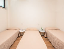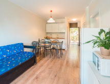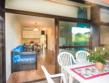 "Trilo Garden", 3-Zimmer-Wohnung 55 m2, im Erdgeschoss. Schön und modern eingerichtet: Wohn-/Schlafzimmer mit 1 Diwanbett, Esstisch, Digital-TV, Flachbildschirm, E-Heizung und Klimaanlage. Ausgang zum Garten, zur Veranda. 1 Doppelzimmer. Ausgang zum Garten, zur Veranda. 1 Zimmer mit 3 Betten. Offene Küche (4 Induktionskochplatten, Mikrowelle, elektrische Kaffeemaschine, Kapseln für die Kaffeemaschine (Nescafe Dolce Gusto) extra). Dusche/Bidet/WC. Balkon 14 m2, Gartensitzplatz. Balkonmöbel. Sicht auf das Schwimmbad. Zur Verfügung: Kinderhochstuhl, Babybett bis 2 Jahre (extra), Haartrockner. Internet (Wireless LAN, gratis). Bitte beachten: Feuerlöscher. Residenz. Objekt mit Aufzug. Im Idyllischen Garten geniessen Sie Erholung als ein Naturerlebnis. Auf dem Spielplatz können sich die Kinder austoben. Auch wenn es in der Nacht noch so heiss bleibt, ist es schön, kann man die Klimaanlage einschalten und in einem angenehm temperierten Raumklima schlafen. Eine Veranda ist verfügbar. Ein Babybett ist vorhanden. Ein Kinderbecken ist vorhanden. Sollte das Wetter einmal nicht mitspielen, ist auch ein Fernseher vorhanden. Frische Bettwäsche verfügbar. Es gibt ein Tischtennistisch. Um auch mal was schnell selber zuzubereiten, steht ein Mikrowellenofen parat.- Charakteristik des Mietobjekts
