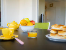 Bidart: Residenz "Uhaina". 900 m vom Meer, 900 m vom Strand. Parkplatz. Lebensmittelgeschäft 1 km, Einkaufszentrum 3.5 km, Restaurant, Bar 800 m, Bäckerei 1.5 km, Café 1 km, Fahrradverleih 1.5 km, Bahnstation "Guethary" 2 km, Sandstrand "Uhabia" 900 m, Thermalbad "Hélianthal Saint Jean de Luz" 7 km. Golfplatz (18 Loch) 9 km, Surfschule 900 m. Nahe gelegene Sehenswürdigkeiten: Bidaparc 900 m. Wandergebiete: La Rhune 15 km. Die Schlüsselübergabe findet bei der Agentur Interhome in Bidart statt.Interior