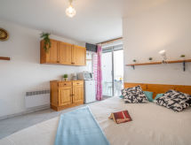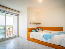 1-Zimmer-Studio 25 m2 im 4. Stock. Wohn-/Esszimmer mit 1 franz. Bett (140 cm, Länge 190 cm), TV (Flachbildschirm). Eingang mit 1 x 2 Etagenbetten (80 cm, Länge 190 cm). Kochnische (2 Glaskeramikherd Platten, Toaster, Wasserkocher, Mikrowelle, elektrische Kaffeemaschine). Bad, sep. WC. E-Heizung. Terrasse 8 m2, Südlage. Terrassenmöbel. Eingeschränkte Sicht auf das Meer. Zur Verfügung: Waschmaschine. Internet (Wireless LAN, extra). Parkplatz. Bitte beachten: Maximal 1 Haustier/Hund erlaubt. Rauchmelder. Eine Badewanne ist vorhanden. Ein Internetanschluss ist vorhanden.- Charakteristik des Mietobjekts