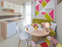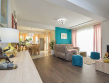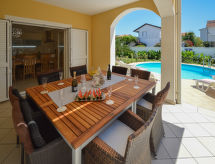 6-Zimmer-Doppelhaushälfte 170 m2 auf 2 Stockwerken. Komfortabel und modern eingerichtet: Wohn-/Esszimmer 50 m2 mit Sat-TV (Flachbildschirm), DVD und Klimaanlage. Ausgang zur Terrasse. 1 Zimmer mit 1 franz. Bett (180 cm, Länge 200 cm). 1 Zimmer mit 1 franz. Bett (180 cm, Länge 200 cm). Ausgang zur Terrasse. 1 Zimmer mit 2 Betten (90 cm, Länge 200 cm). Ausgang zur Terrasse. Offene Küche (Backofen, Geschirrspüler, 4 Glaskeramikherd Platten, Mikrowelle, Tiefkühler, elektrische Kaffeemaschine). Dusche/WC. Obergeschoss: 1 Zimmer 10 m2 mit 1 franz. Bett (160 cm, Länge 200 cm), Dusche/WC und Sat-TV (Flachbildschirm), Klimaanlage. Ausgang zur Terrasse. 1 Zimmer mit 1 franz. Bett (160 cm, Länge 200 cm). Küche (2 Glaskeramikherd Platten) mit Esstisch. Dusche/WC. Terrasse 20 m2 teilweise überdacht, 3 Terrassen 4 m2. Terrassenmöbel. Sicht auf das Schwimmbad. Zur Verfügung: Babybett. Internet (Wireless LAN, gratis). Die drückende Hitze kann Körper und Gemüt stark belasten. Deshalb sind die Räumlichkeiten mit Klimaanlagen ausgestattet. Eine Terrasse ist vorhanden. Es hat ein privater Pool. Sollte das Wetter einmal nicht mitspielen, ist auch ein Fernseher vorhanden. Das Haus ist auch mit einem DVD Spieler ausgestattet.- Ausstattung