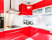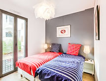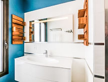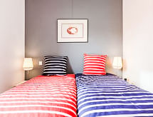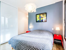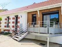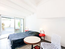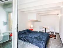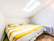 5-Zimmer-Haus 95 m2 auf 2 Stockwerken. Sehr modern eingerichtet: Wohn-/Esszimmer mit TV (Flachbildschirm). Ausgang zur Terrasse. 1 abgeschrägtes kleines Zimmer mit Dachfenster mit 2 Betten (90 cm, Länge 190 cm), Waschbecken und Dusche. 1 Zimmer mit 2 Betten (90 cm, Länge 190 cm). 1 Zimmer mit 1 Doppelbett (1 x 160 cm, Länge 190 cm). Kleine Küche (Backofen, Geschirrspüler, 3 Induktionskochplatten, Mikrowelle, Tiefkühler). Dusche, sep. WC. G-Heizung. Unteres Geschoss: 1 Zimmer mit 1 franz. Bett (1 x 140 cm, Länge 190 cm). Kleine Terrasse. Terrassenmöbel. Zur Verfügung: Waschmaschine, Wäschetrockner, Bügeleisen. Internet (Wireless LAN, gratis). Parkplatz (eingezäunt, 2 Autos). Bitte beachten: Rauchmelder. Zimmer auf der Hauptebene mit zwei 90cm Betten und Dusche über 5 Stufen erreichbar. Raum auf der unteren Ebene nur von außen zugänglich. Ein Wäschetrockner ist vorhanden.- Ausstattung