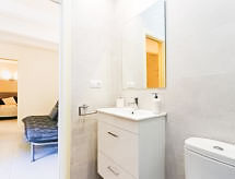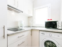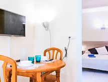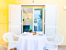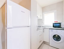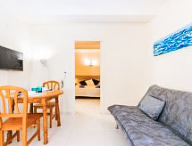 2-Zimmer-Wohnung 35 m2. Zweckmässig eingerichtet: Wohn-/Esszimmer mit 1 Diwanbett und TV. 1 Zimmer mit 2 Betten (90 cm, Länge 190 cm). Offene Küche (2 Glaskeramikherd Platten, Mikrowelle, Tiefkühler, elektrische Kaffeemaschine). Dusche/WC. Keine Heizmöglichkeit. Terrassenmöbel. Zur Verfügung: Waschmaschine. Internet (Wireless LAN, gratis). Bitte beachten: kein Parkplatz. TV nur ES, FR, DE. Bitte beachten: Es gibt keinen paking und private Terrasse. Bitte beachten : Wohnungen ohne Heizung. HUTG007511 Ein Pool ist vorhanden.- Ausstattung