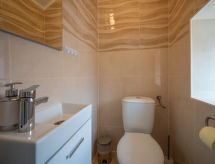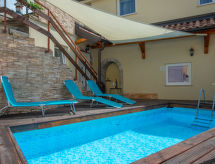 6-Zimmer-Haus 124 m2 auf 2 Stockwerken. Wohn-/Esszimmer mit 1 Diwanbett (120 cm, Länge 190 cm), Küchenblock und Sat-TV (Flachbildschirm), Klimaanlage. Esszimmer. Offene Küche (2 Kochplatten, Mikrowelle, elektrische Kaffeemaschine). Obergeschoss: Eingang mit Klimaanlage. 1 Zimmer mit Dachfenster mit 1 franz. Bett (160 cm, Länge 200 cm). 1 Zimmer mit Dachfenster mit 2 Betten (90 cm, Länge 200 cm). Wohnzimmer mit 1 Doppeldiwanbett (140 cm, Länge 190 cm), Sat-TV (Flachbildschirm), Klimaanlage. Ausgang zur Terrasse. 1 Zimmer mit 1 franz. Bett (160 cm, Länge 200 cm). 1 Zimmer mit 1 Bett (90 cm, Länge 200 cm). 2 Duschen/WC, 2 sep. WC's. Terrasse 16 m2. Terrassenmöbel, Gartengrill (mobil), Liegestühle (3). Zur Verfügung: Safe, Kinderhochstuhl, Babybett, Haartrockner. Internet (Wireless LAN, gratis). 1. Wohnung: Wohn-/Esszimmer, offene Küche unten, 2 Schlafzimmer im 1. Stock. 2. Wohnung: Esszimmer, offene Küche unten, Wohnzimmer, 2 Schlafzimmer im 1. Stock. Die drückende Hitze kann Körper und Gemüt stark belasten. Deshalb sind die Räumlichkeiten mit Klimaanlagen ausgestattet. Das Haus ist auch mit einer Terrasse ausgestattet. Es hat ein privater Pool. Dank der Waschmaschine die Sie vorfinden, sind weniger Kleider zum mitschleppen.- Ausstattung