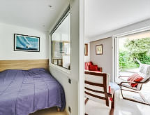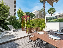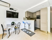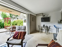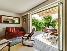 1-Zimmer-Wohnung 40 m2, im Erdgeschoss. Geräumig, vollständig renoviert, komfortabel und schön eingerichtet: Wohn-/Esszimmer mit TV und Klimaanlage. Ausgang zur Terrasse. Schlafnische mit 1 franz. Bett (140 cm, Länge 190 cm). Offene Küche (Geschirrspüler, 3 Induktionskochplatten, Kombinationsmikrowelle). Dusche, sep. WC. Warmluftheizung. Terrasse 20 m2, Gartensitzplatz 20 m2. Terrassenmöbel. Sicht auf das Schwimmbad. Zur Verfügung: Waschmaschine. Internet (Wireless LAN, gratis). Bitte beachten: Rauchmelder. 06029009279WF Residenz. Frisch geduscht und duftend kann man entspannt zum Ferienprogramm übergehen, denn eine Dusche ist vorhanden. Eine Terrasse ist verfügbar. Unabhängiger sind Sie mit der eigens vorhandenen Waschmaschine.- Charakteristik des Mietobjekts