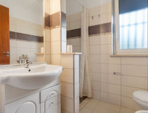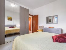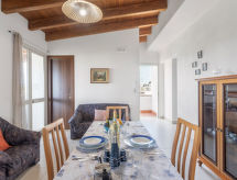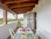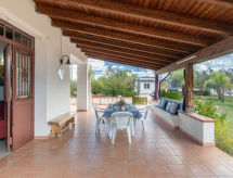 7-Zimmer-Haus 180 m2 auf 2 Stockwerken, im Erdgeschoss. Zweckmässig und komfortabel eingerichtet: Wohn-/Esszimmer mit TV (Flachbildschirm), Klimaanlage und Warmluftheizung. Ausgang zur Terrasse. 1 Doppelzimmer mit Ventilator. 1 Zimmer mit 2 Betten und Ventilator. 1 Zimmer mit 1 x 2 Etagenbetten, Ventilator. Kochnische (4 Kochplatten, Mikrowelle, Tiefkühler, elektrische Kaffeemaschine). Dusche/Bidet/WC. Klimaanlage, Warmluftheizung (extra), Boiler (50 Liter). Obergeschoss: (Aussentreppe) Wohn-/Esszimmer mit TV (Flachbildschirm). Ausgang zur Terrasse. 1 Doppelzimmer mit Ventilator. 1 Zimmer mit 1 Doppelbett (140 cm). Kochnische (4 Kochplatten, Tiefkühler). Dusche/Bidet/WC. Terrasse 25 m2, überdacht Terrasse 20 m2, überdacht. Terrassenmöbel, Gartengrill. Fernsicht auf das Meer und die Berge. Zur Verfügung: Waschmaschine, Bügeleisen, Fliegengitter, Kinderhochstuhl, Babybett bis 2 Jahre, Haartrockner. Internet (Wireless LAN, gratis). Maximal 1 Haustier/Hund erlaubt. Damit es auch im Sommer angenehm kühl bleibt, verfügt dieses Ferienobjekt über eine Klimaanlage. Es hat eine Veranda. Geeignet für ein Barbecue.- Ausstattung
