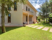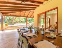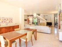 5-Zimmer-Villa 320 m2 auf 2 Stockwerken. Komfortabel und geschmackvoll eingerichtet: grosses Wohn-/Esszimmer mit Panoramafenster mit TV (Flachbildschirm). Ausgang zum Garten, zum Gartensitzplatz, zum Schwimmbad. Küche (4 Kochplatten, Backofen, Geschirrspüler, Toaster, Wasserkocher, Mikrowelle, Tiefkühler) mit kleinem Esstisch. Ausgang zum Gartensitzplatz. Dusche/WC. Obergeschoss: 1 Doppelzimmer 50 m2 mit Bad/Dusche/Bidet/WC, Doppelwaschbecken, Klimaanlage und Warmluftheizung. Ausgang zum Balkon. 2 Doppelzimmer, jedes Zimmer mit Klimaanlage und Warmluftheizung. Ausgang zum Balkon. 1 Zimmer mit 2 Betten, Klimaanlage und Warmluftheizung. Ausgang zum Balkon. Durchgangszimmer. Ausgang zum Balkon. Dusche/Bidet/WC. Klimaanlage, Warmluftheizung. 4 Balkone 4 m2, grosser Gartensitzplatz 50 m2, überdacht. Terrassenmöbel, Liegestühle. Zur Verfügung: Waschmaschine, Bügeleisen, Kinderhochstuhl, Babybett bis 2 Jahre, Haartrockner. Internet (Wireless LAN, gratis). Parkplatz (3 Autos). Ein Balkon ist vorhanden. Es hat eine Veranda. Es hat ein Geschirrspüler. Ein Pool ist vorhanden. Es hat ein privater Pool. Ein drahtloses lokales Netzwerk (WLAN) ist vorhanden.- Charakteristik des Mietobjekts