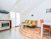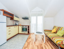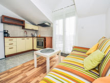 2-Zimmer-Wohnung 45 m2, im Dachgeschoss. Abgeschrägtes Wohn-/Esszimmer 20 m2, Deckenhöhe 160 - 360 cm mit 1 Diwanbett (120 cm, Länge 190 cm), Sat-TV (Flachbildschirm). Ausgang zum Balkon. Eingang mit Klimaanlage. 1 Zimmer mit 1 Doppelbett (2 x 80 cm, Länge 200 cm). Ausgang zum Balkon. Offene Küche (Backofen, 4 Glaskeramikherd Platten, Mikrowelle, Tiefkühler, elektrische Kaffeemaschine). Dusche/WC. 2 Balkone 3 m2. Balkonmöbel. Sicht auf das Meer. Zur Verfügung: Waschmaschine, Haartrockner. Internet (Wireless LAN). Auch wenn es in der Nacht noch so heiss bleibt, ist es schön, kann man die Klimaanlage einschalten und in einem angenehm temperierten Raumklima schlafen. Das Haus ist auch mit einem Balkon ausgestattet. Geeignet für ein Barbecue.- Ausstattung