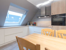 "Tussen water en wind", 3-Zimmer-Wohnung 80 m2 auf 2 Stockwerken im 3. Stock. Geräumig, teilweise renoviert im Jahre 2020, komfortabel und gemütlich eingerichtet: Eingang mit sep. WC. 1 kleines Kinderzimmer mit 1 Ausziehbett (2 x 80 cm, Länge 200 cm). Wohn-/Esszimmer mit TV, Internationale TV-Sender, Flachbildschirm, CD, DVD, Heimkino E-Heizung und Klimaanlage. Offene Küche (Geschirrspüler, 4 Glaskeramikherd Platten, Toaster, Wasserkocher, Tiefkühler, elektrische Kaffeemaschine, Kombinationsmikrowelle) mit Esstisch. Sep. WC. Obergeschoss: (Wendeltreppe) 1 Doppelzimmer mit 1 Doppelbett (1 x 160 cm, Länge 200 cm). Bad/Dusche/WC, Doppelwaschbecken. Balkon, Südwestlage. Balkonmöbel. Zur Verfügung: Waschmaschine, Wäschetrockner, Haartrockner. Internet (Wireless LAN, gratis). Bitte beachten: Nichtraucher-Haus, kein Parkplatz. Maximal 1 Haustier/Hund erlaubt. Auch ihr Hund ist hier ein gern gesehen Feriengast, schließlich gehört er zur Familie. Das Haus ist auch mit einem Balkon ausgestattet. Ein Babybett ist vorhanden. Ein drahtloses lokales Netzwerk (WLAN) ist vorhanden. Es gibt ein DVD Spieler.- Charakteristik des Mietobjekts