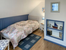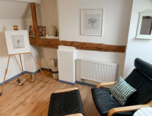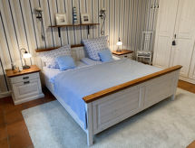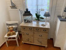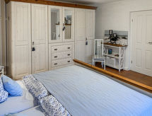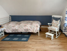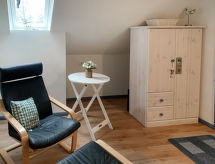 3-Zimmer-Haus 95 m2 auf 2 Stockwerken, im Erdgeschoss. Modern und geschmackvoll eingerichtet: Wohn-/Esszimmer mit Schwedenofen und Sat-TV (Flachbildschirm), Radio. 1 Zimmer mit 1 Doppelbett (2 x 90 cm, Länge 200 cm). Kochnische (Backofen, Geschirrspüler, 4 Glaskeramikherd Platten, Toaster, Wasserkocher, Mikrowelle, elektrische Kaffeemaschine). Dusche/WC. Fussbodenheizung. Obergeschoss: 1 abgeschrägtes Zimmer mit 2 Betten (90 cm, Länge 200 cm). Grosse Terrasse. Terrassenmöbel, Gartengrill (mobil). Zur Verfügung: Waschmaschine, Wäschetrockner, Haartrockner, Holz (extra). Bitte beachten: Nichtraucher-Haus. Rauchmelder. Geeignet zum Grillen.- Ausstattung