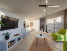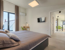 5-room villa 160 m2 on 2 levels. Living/dining room with satellite TV (flat screen), air conditioning. 2 rooms, each room with 1 double bed (2 x 90 cm, length 200 cm), satellite TV (flat screen), air conditioning. Exit to the swimming pool. Open kitchen (oven, dishwasher, 4 ceramic glass hob hotplates, microwave, freezer, electric coffee machine). Shower/WC, sep. WC. Upper floor: open walk-through room with 2 sofabeds (90 cm, length 200 cm), satellite TV (flat screen), air conditioning. Exit to the terrace. 1 room with 1 double bed (2 x 90 cm, length 200 cm), satellite TV (flat screen), air conditioning. Exit to the terrace. Shower/WC. Forced-air heating. Terrace 8 m2, terrace 6 m2. Terrace furniture, deck chairs. Partial view of the sea. Facilities: safe, baby cot, hair dryer. Internet (WiFi, free).- Facilities