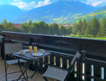 "Appartement Rose", 1-room apartment 35 m2 on 3rd floor. Object suitable for 2 adults + 2 children. Comfortable and modern furnishings: living/sleeping room with 2 beds, 1 double sofabed, dining nook and cable TV (flat screen). Exit to the balcony. Open kitchen (oven, 4 ceramic glass hob hotplates, toaster, kettle, microwave, freezer). Bath/shower, sep. WC. Electric heating. Balcony 11 m2. Balcony furniture, deck chairs (2). Marvellous panoramic view of the mountains and the garden. Facilities: baby cot for up to 2 year olds. Internet (WiFi, free). Please note: suitable for families. Non-smokers only. Smoke alarm, fire extinguisher. 50402-000675-2020- Characteristics of the accommodation