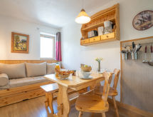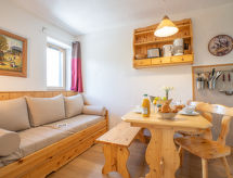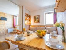 "Arcelle 508", 2-room apartment 26 m2 on 5th floor, south-west facing position. Comfortable and beautiful furnishings: living/dining room with heating stove. 1 small room 6 m2 with sliding door with 1 double sofabed (140 cm, length 190 cm), TV (flat screen), heating stove. Sleeping alcove with 1 x 2 bunk beds. Kitchenette (2 hot plates, oven, dishwasher, electric coffee machine). Bathroom, sep. WC. Beautiful view of the mountains and the ski run. Facilities: Internet (WiFi, extra). Please note: maximum 1 pet/ dog allowed. Smoke alarm.- Characteristics of the accommodation