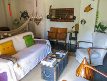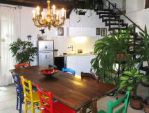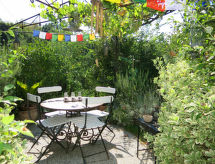 3-room semi-detached house 65 m2. Cosy furnishings: open kitchen (mini-oven, 2 gas rings, toaster, kettle, freezer, electric coffee machine) with Scandinavian wood stove and dining table. Exit to the garden. Upper floor: open living room with TV and hi-fi system. 1 room with sloping ceilings with 1 double bed, shower/WC and air conditioning. Gas heating. Parquet floors. Terrace. Terrace furniture, barbecue (portable). Panoramic view. Facilities: children's high chair, baby cot. Internet (WiFi, free). Please note: private entrance. CIR: 00500500053- Facilities