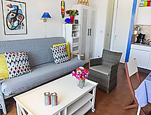 1-room apartment 21 m2 on 2nd floor. Living/dining room with 1 double sofabed (140 cm, length 190 cm), TV (flat screen). Entrance hall with 1 x 2 bunk beds (90 cm, length 190 cm). Kitchenette (4 hot plates, toaster, kettle, electric coffee machine, combination microwave). Shower/WC. Terrace 8 m2, south facing position. Terrace furniture. View of the swimming pool. Facilities: Internet (WiFi, extra). Reserved parking. Please note: maximum 1 pet/ dog allowed. Smoke alarm.- Characteristics of the accommodation