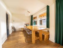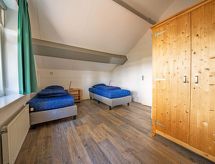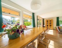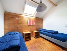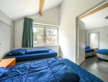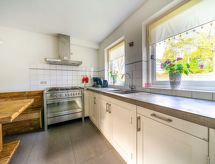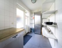 "Familievilla 12", 6-room villa 112 m2 on 2 levels. Comfortable furnishings: entrance hall with separate WC. Living/dining room with dining table and digital TV. Exit to the terrace. 1 double bedroom with 1 double bed. Open kitchen (4 hot plates, oven, dishwasher, microwave, electric coffee machine, Capsules for coffee machine (Nespresso) extra). Shower. Heating. Upper floor: 1 double bedroom with 1 double bed. 4 double bedrooms, each room with 2 beds. Shower/WC. Terrace. Terrace furniture. Facilities: washing machine, dryer. Internet (WiFi, free). Please note: non-smoking house. Smoke alarm.- Facilities