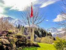 3-room apartment 78 m2, on the ground floor. Spacious and bright, modern and tasteful furnishings: living/dining room with dining table, cable TV, radio and CD-player. 1 room with 1 double bed (1 x 160 cm, length 200 cm). 1 room with 1 bed (90 cm, length 200 cm), 1 x 2 bunk beds (90 cm, length 200 cm). Open kitchen (oven, dishwasher, 4 induction hot plates, toaster, kettle, electric coffee machine, Capsules for coffee machine (Nespresso) extra, raclette grill, fondue Set (chinoise, cheese)). Bath/WC, shower/WC. Large terrace. Terrace furniture, barbecue (portable), deck chairs. Very beautiful view of the mountains. Facilities: hair dryer. Internet (WiFi, free). Please note: suitable for families. Non-smokers only.- Characteristics of the accommodation